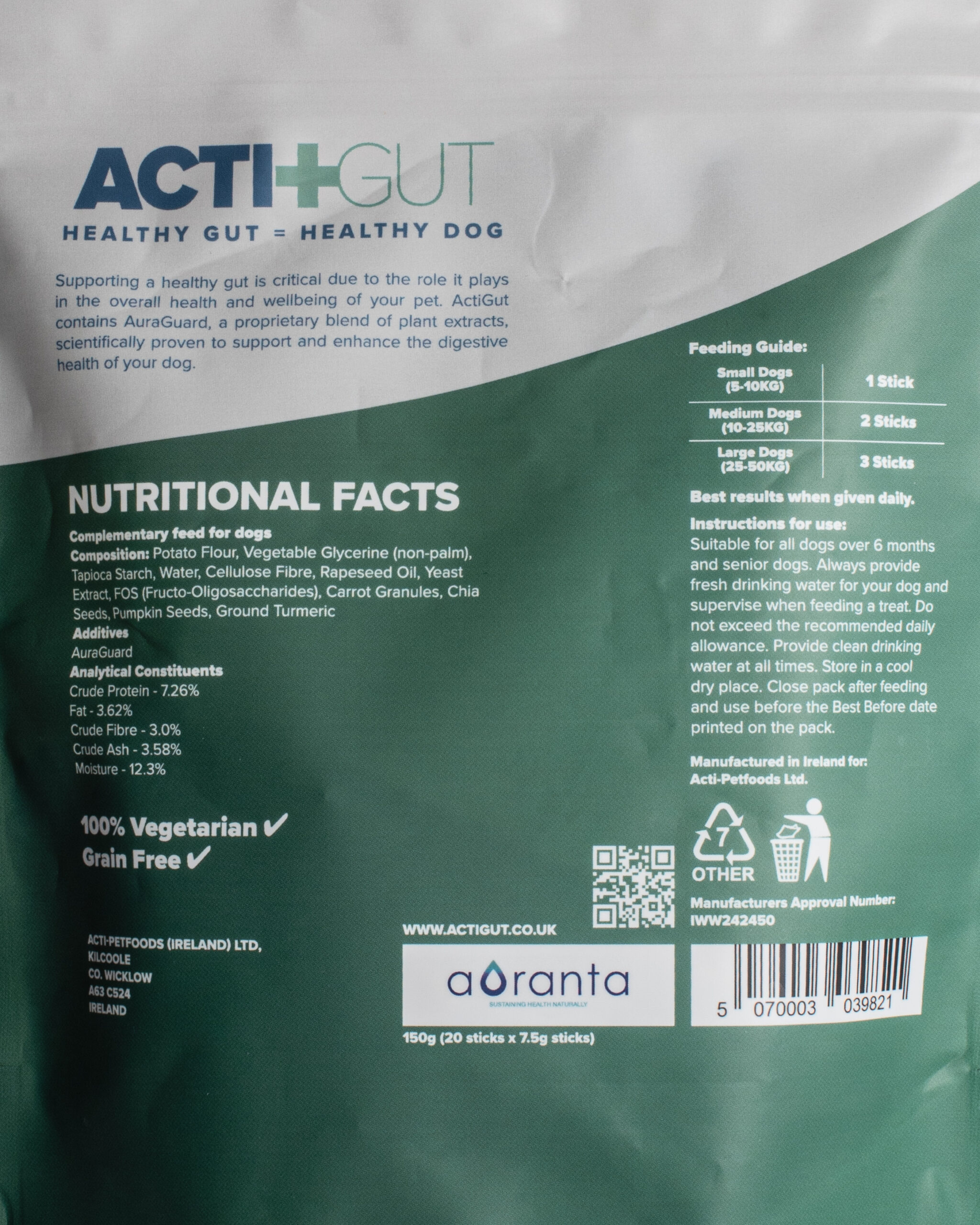 Supporting a healthy gut is critical due to the role it plays in the overall health and wellbeing of your pet. ActiGut contains AuraGuard, a proprietary blend of plant extracts, scientifically proven to support and enhance the digestive health of your dog.